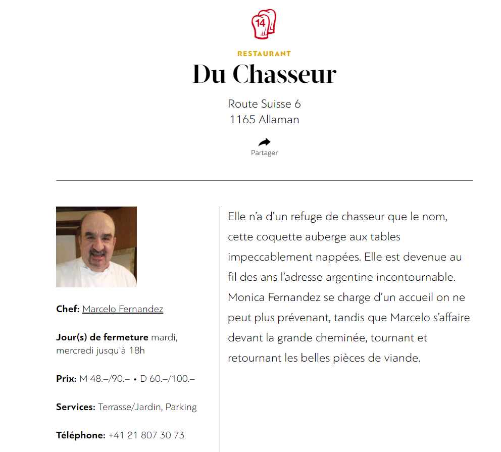 En entrée, la salade Waldorf de la pampa est savoureuse et rapicolante. Tout aussi convaincant, le saumon mariné par le chef ne manque pas de caractère avec ses «épices patagoniques». Et les empanadas sont toutes fraîches, pâte friable et garniture juteuse. Puis la classique entrecôte de bœuf tient ses promesses: rassise, tendre comme du beurre et goûteuse, elle est grillée au feu de bois de hêtre et accompagnée de sauce chimichurri. Lacs et mers sont aussi de la partie avec les filets de perche qui proviennent d’un pêcheur du village, les cuisses de grenouille de Vallorbe et les noix de Saint-Jacques juste snackées.