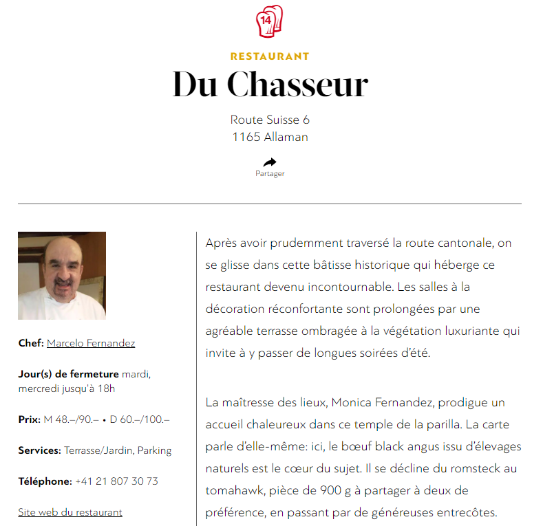 La maîtresse des lieux, Monica Fernandez, prodigue un accueil chaleureux dans ce temple de la parilla. La carte parle d’elle-même: ici, le bœuf black angus issu d’élevages naturels est le cœur du sujet. Il se décline du romsteck au tomahawk, pièce de 900 g à partager à deux de préférence, en passant par de généreuses entrecôtes. Mais le menu fait aussi la part belle à des mets alléchants tels que les filets de perche d’Allaman ou les cuisses de grenouille fraîchement livrées de Vallorbe, ainsi qu’une carte de saison qui réserve encore de belles surprises.